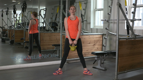 - Agarrá una pesa rusa (kettlebell) con las dos manos (el peso corre por tu cuenta).