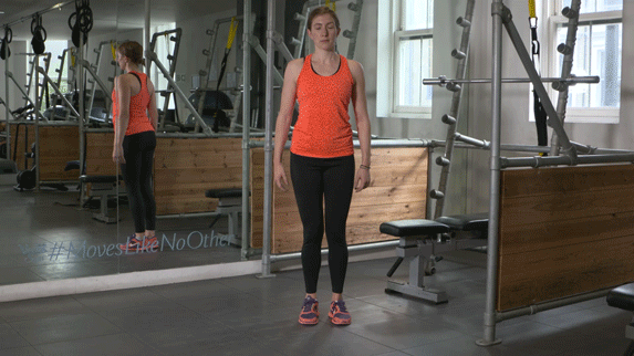 - Sostené la pesa mientras bajás con ambas piernas hasta que la misma esté bien cerquita del piso.